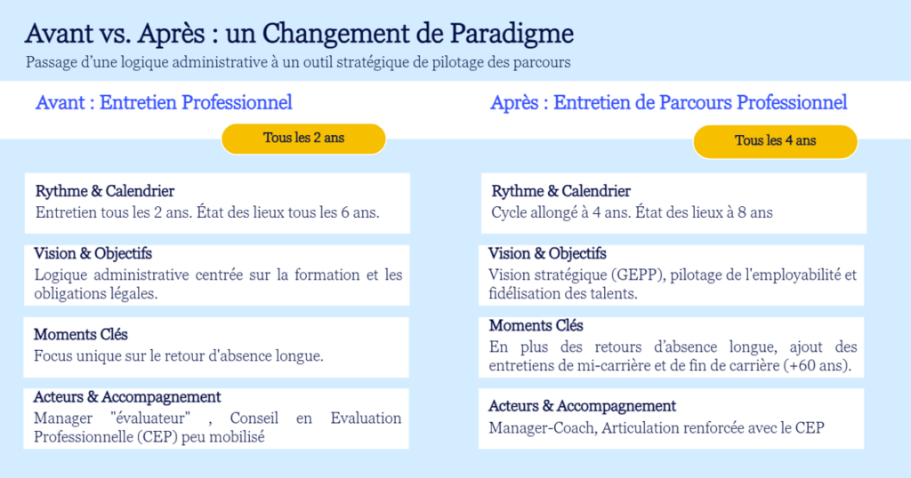 La fréquence initiale de ces entretiens (tous les 2 ans) était perçue comme trop fréquente, rendant l’exercice artificiel. En somme, l’entretien professionnel peinait à produire de réels effets sur les parcours professionnels et restait largement déconnecté des enjeux de gestion des compétences (GEPP).