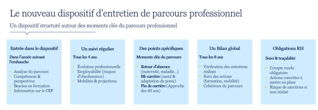 Désormais, le dispositif est structuré autour de moments clés du parcours professionnel et prévoit :