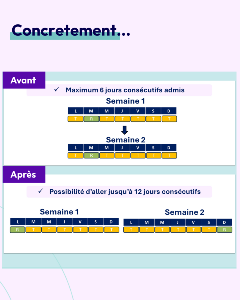 Les employeurs peuvent désormais concevoir des plannings intégrant des séquences de jours travaillés supérieures à 6 jours, dès lors qu’un jour de repos hebdomadaire est bien positionné dans chaque semaine civile.